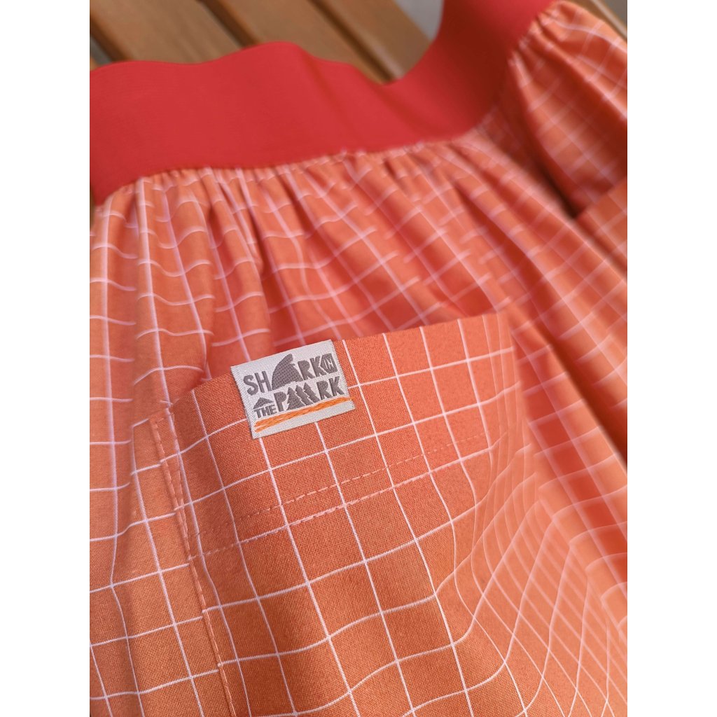 Tahle bavlněná sukně s velkými kapsami je miláček mezi sukněmi. Nápaditost jí rozhodně nechybí. Drobná, cihlově hnědá lineární kostka a široká červená guma je kombinace, se kterou nešlápnete vedle.