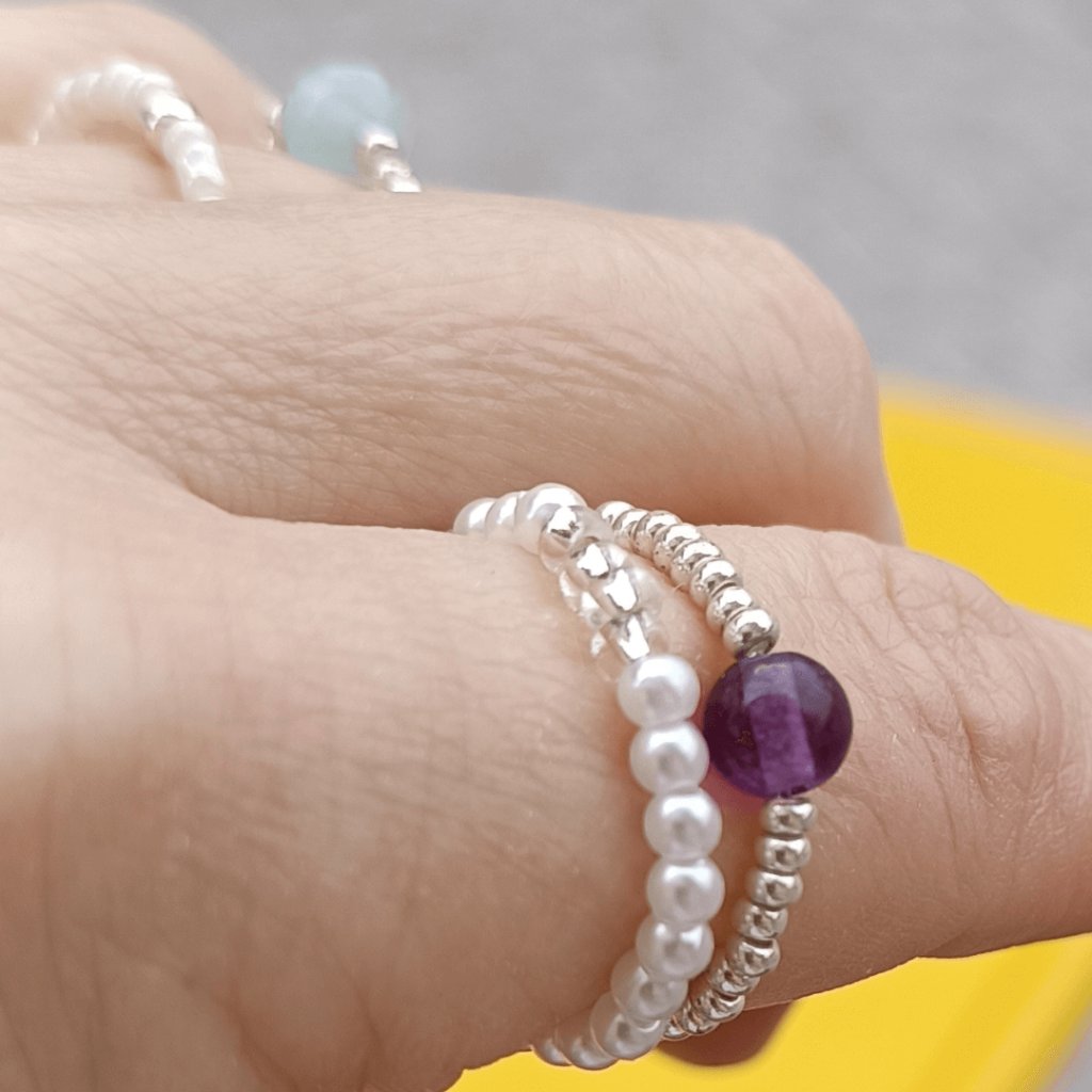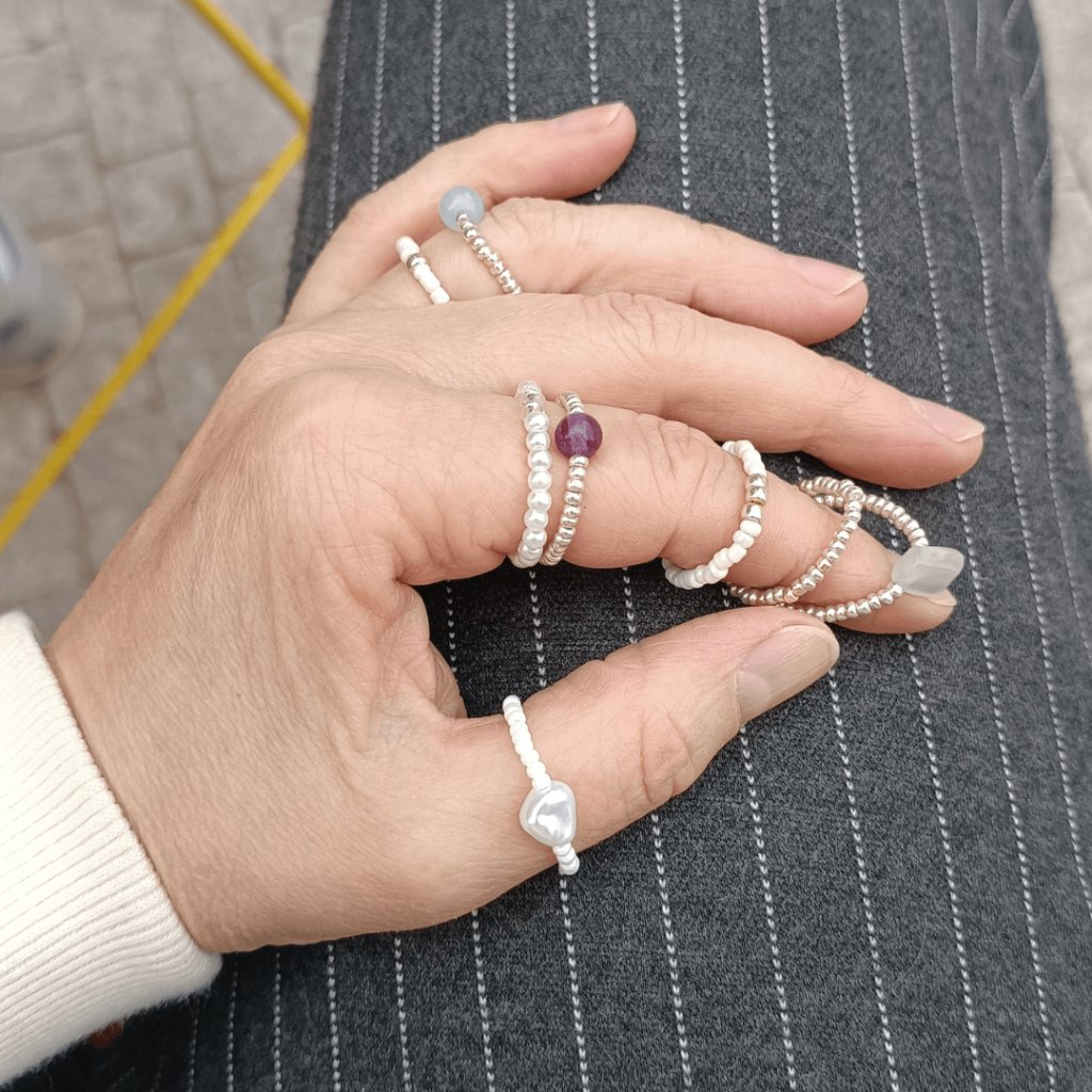 Něžný prstýnek, ručně navlékaný z malých korálků. Každý je jiný, ale všechny jsou krásné a většinou laděné do světlých barev. Na každém z nich najdete také větší korálek z minerálu, říční perlu anebo bude zajímavě poskládaný jen z malých korálků.